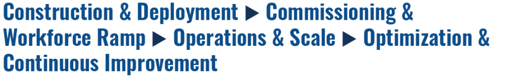 Each phase, from construction through optimization, requires distinct skill sets, timelines, and workforce strategies. When these phases are staffed independently, often across multiple vendors or internal teams, gaps emerge at critical transition points.
